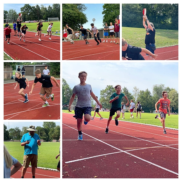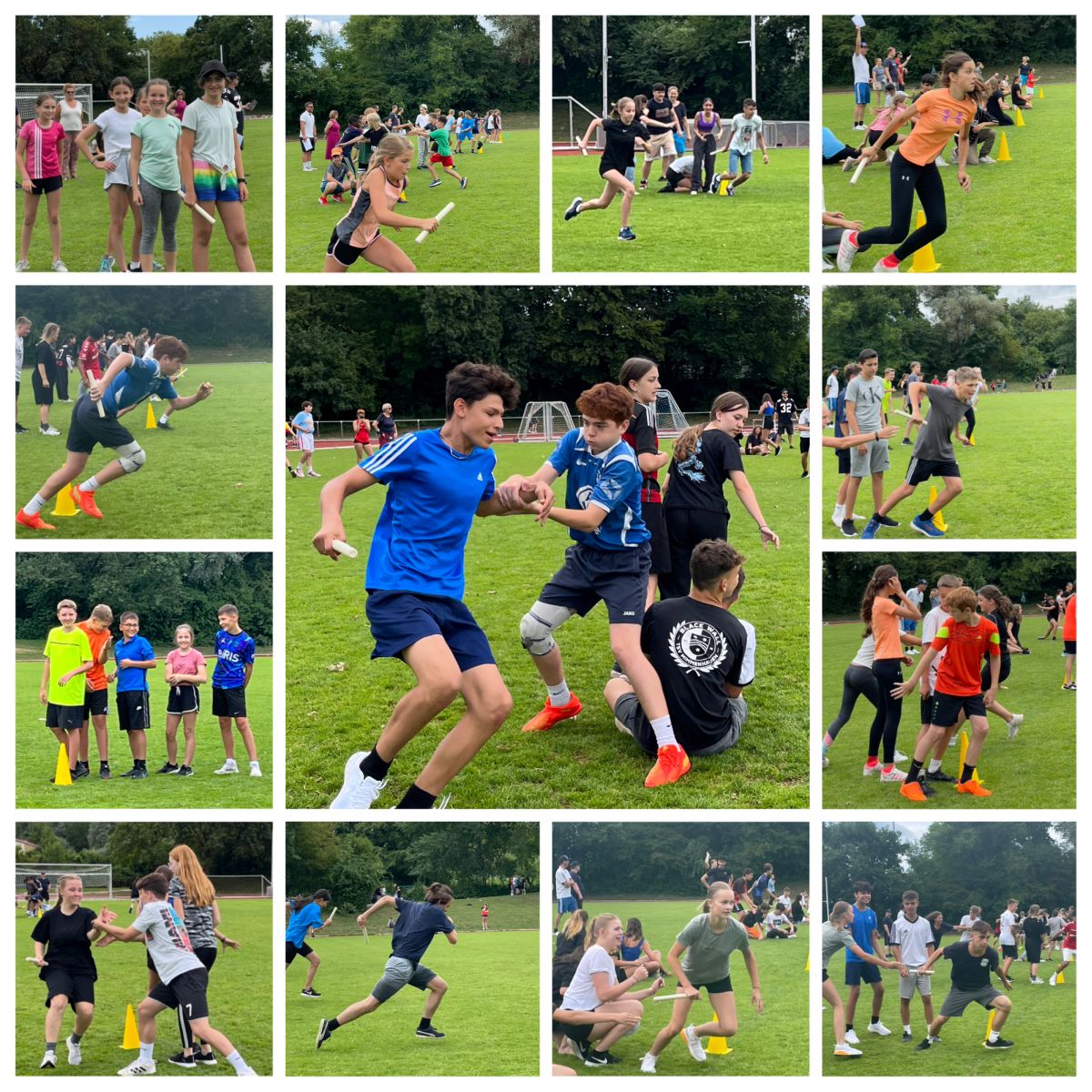 4. Was für eine tolle Stimmung. Alle Klassen sind innerhalb einer Stufe gegeneinander angetreten. Mit den ausgefeiltesten Methode habt ihr den aktiven Läufer einmal um die Gruppe geschleudert, damit dieser vorne den Stab an den nächsten übergeben konntet