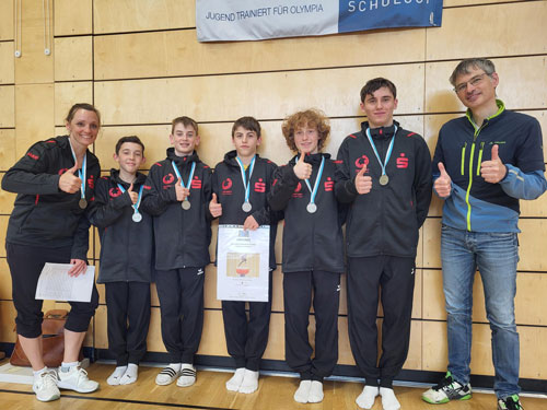 Am 06. Mai fand das Rhein-Main-Donaufinale im Gerätturnen in Würzburg statt. Die Landessieger aus Baden-Württemberg, Rheinland-Pfalz und Bayern traten bei diesem „kleinen“ Bundesfinale“ gegeneinander an und ermittelten die besten Turnerinnen und Turner Süddeutschlands. Die Mannschaft des Gymnasiums Markdorf, bestehend aus Philipp K., Oscar H., n. n., Alexandru H. und Julian P., erreichte hierbei den zweiten Platz. Sie wurden von Frau Jacoby und Herrn Lipinski begleitet und betreut.